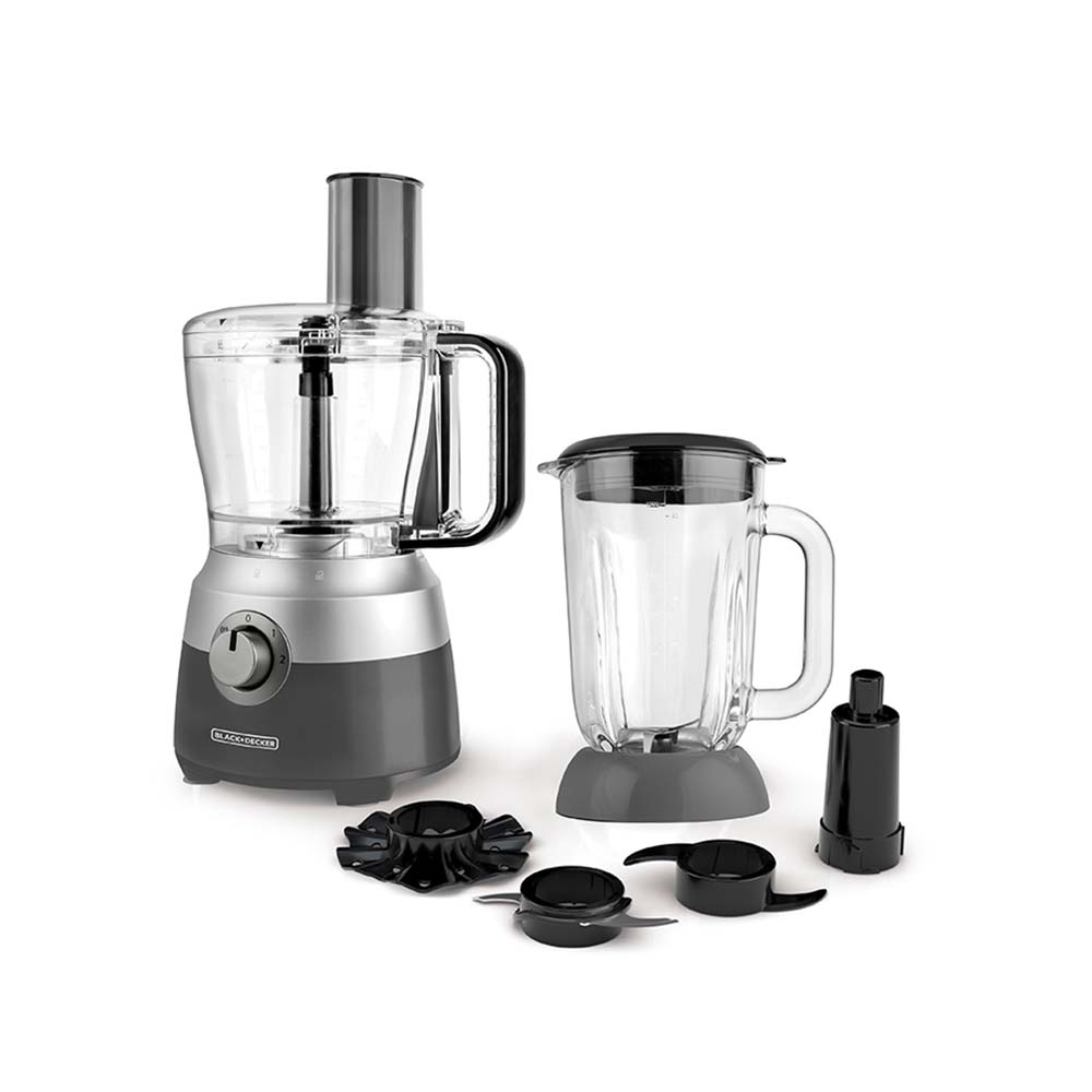 The Black and Decker FP5501 2-in-1 Food Processor and Blender is a versatile kitchen tool designed to handle a variety of food preparation tasks. It comes equipped with 600 watts of power, offering the capability to chop, slice, shred, grate, and puree with ease. The set includes a 10-cup processing container and a 1.5-liter glass blender jar, making it ideal for everything from making smoothies to preparing dough. It features two speeds plus a pulse function, allowing for precise control over food texture and blending consistency. The stainless steel blades are durable and efficient, ensuring fast, even chopping and blending. Additionally, the wide-mouth feeding tube makes it easier to process larger items without pre-cutting them into smaller pieces. The FP5501 includes various accessories, such as slicing and shredding discs, a chopping blade, and a dough blade. It also has an improved safety lock system for safe operation and easy-to-clean, dishwasher-safe parts, making kitchen cleanup simple and quick. If you?re looking for a high-performance food processor and blender for your kitchen, the Black and Decker FP5501 is a reliable choice for everyday cooking and meal preparation. Cooking every day preparing delicious meals and drinks for the whole family is a quick and easy task with the Black and Decker Food Processor with Blender. Prepare from salads to peanut butter, as it has 600 Watts of power and easy-to-place accessories ideal for slicing, mincing, shredding, grating, pureeing, kneading, emulsifying and blending. It has 2 speeds with pulse function for accurate results.