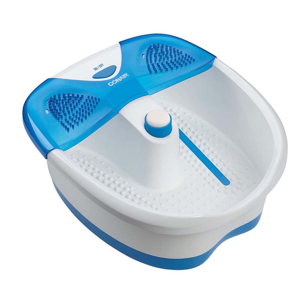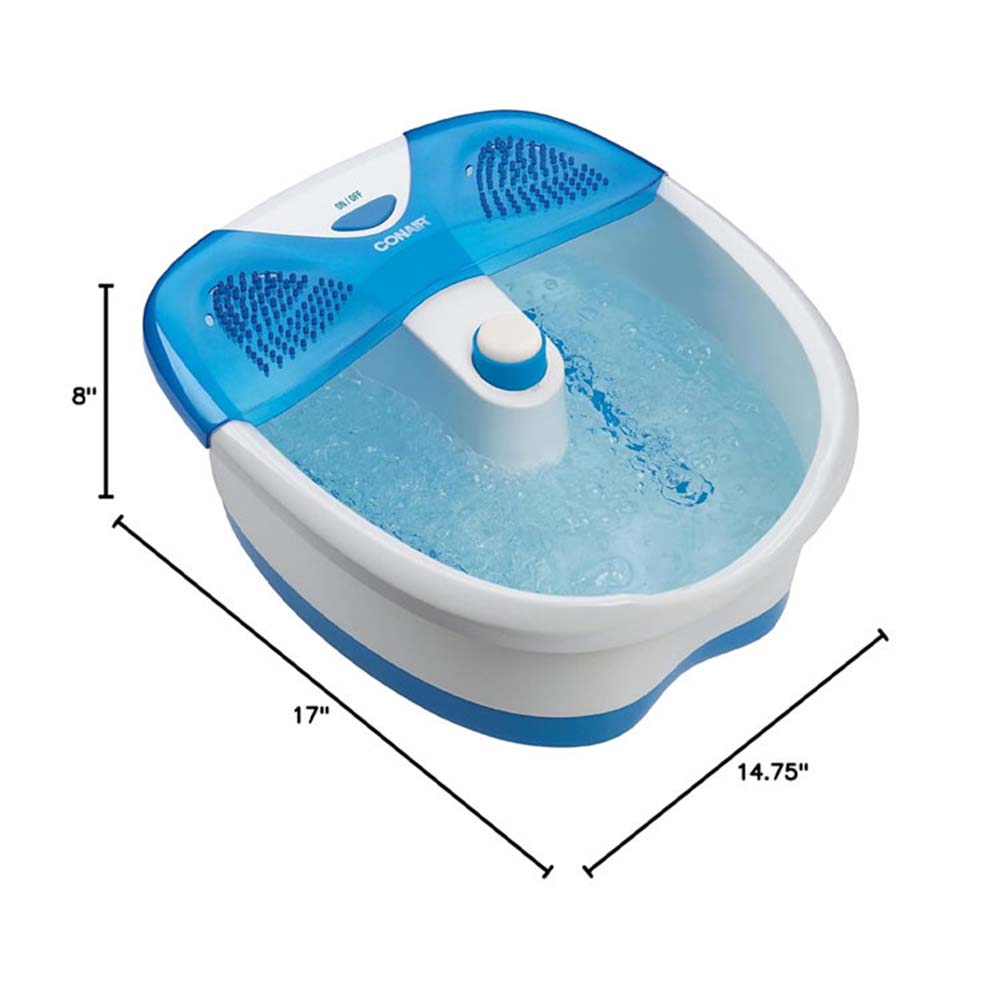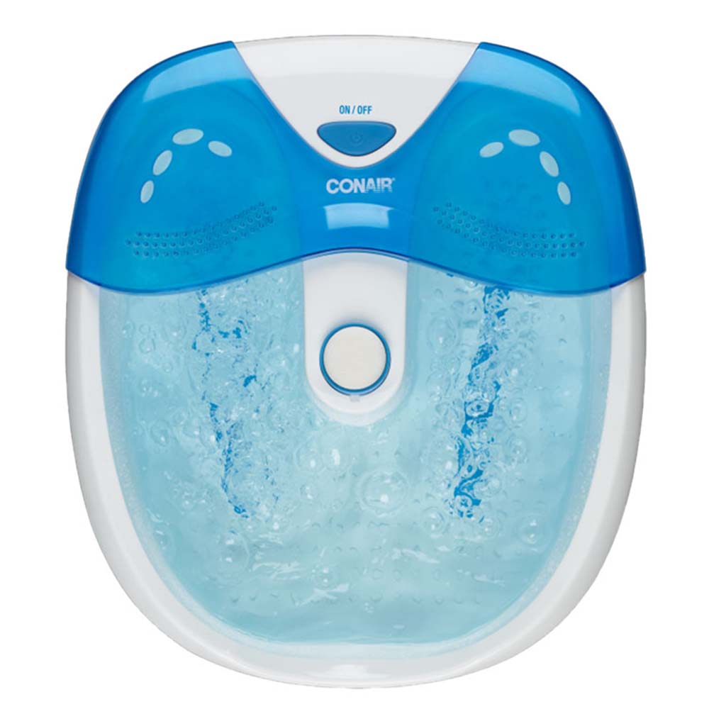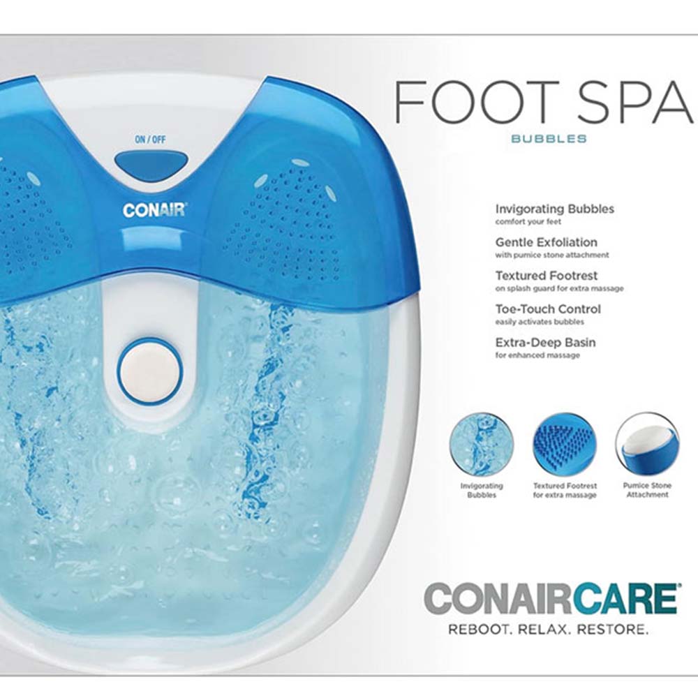Soothe and smooth your feet with an invigorating soak in the Foot Spa with Bubbles & Massage by ConairCare?. Activate the bubbles with the simple toe-touch control and luxuriate in the spa that stimulates and revives tired, achy foot muscles. Swirling water caresses your feet, easing away tension caused by standing, walking, and exercising. Roll your feet across the rounded nodes on the spa floor or raise them out of the water and onto the textured footrest for an invigorating manual massage that rubs your reflex points for ultimate relaxation. The pumice stone attachment buffs away dry skin, exfoliating your feet and leaving them feeling and looking refreshed and renewed.