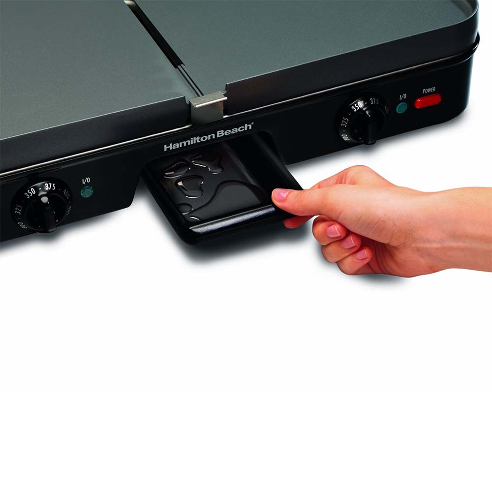 Grill, griddle or both ? all at once. Enjoy the restaurant-quality results you want with the three-in-one cooking functionality you need. Amazingly adaptable, the 3-In-1 Grill/Griddle works as an indoor grill, as a griddle or as a grill and griddle combo. The nonstick, reversible and removable cooking plates are easy to snap in and out of place, and together make up 180 square inches of cooking surface. Two cooking areas with individual, adjustable heat controls lets you prepare an entire meal at once. The center grease channel and tray removes extra fat and reduces mess. The cooking plates and grease tray are both dishwasher safe, making clean up a breeze.