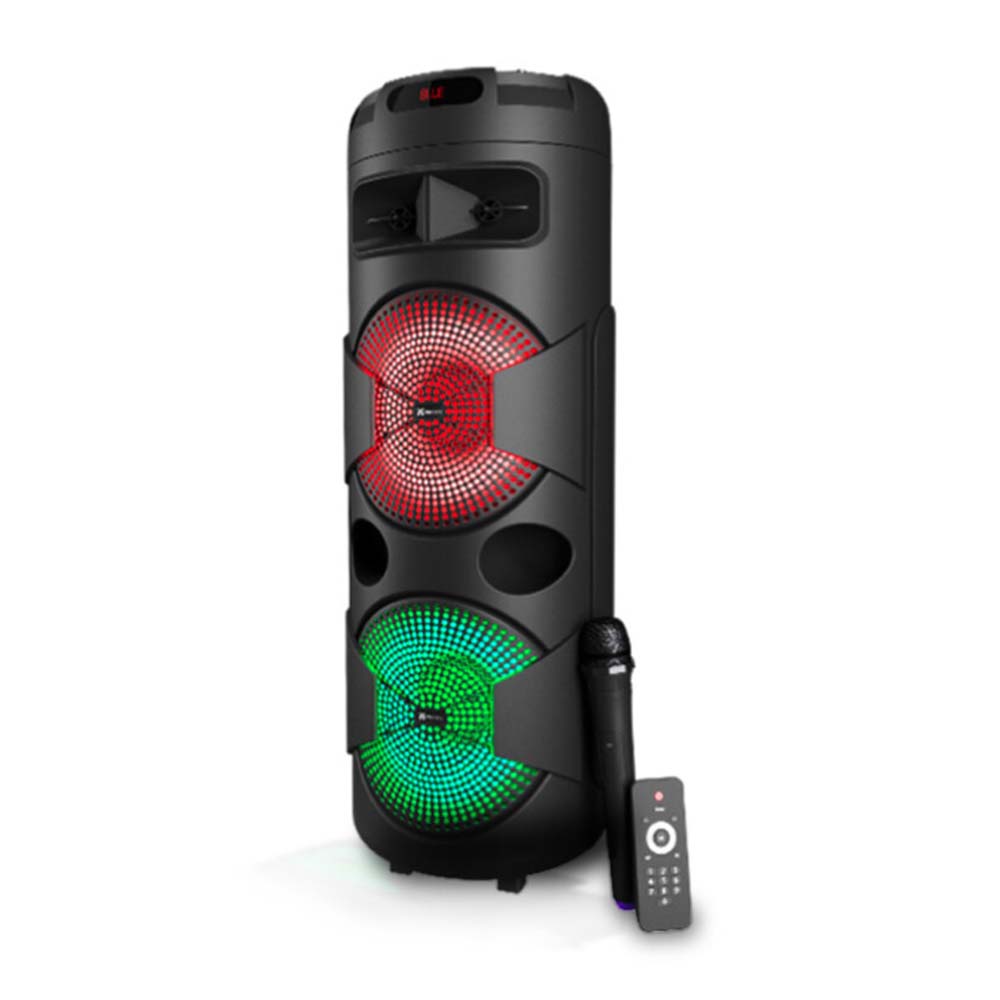 Enjoy lively parties with the excellent 3000 watts streamed by the MagBlaster Pro from KlipXtreme and share unforgettable moments with friends and family. With not one but two powerful 12-inch subwoofers and a 1.5-inch treble, you will dance, sing, or listen to your music like never before. Portable, enjoy music for up to 18 hours thanks to an extra durable lithium battery without connecting the loudspeaker to a wall outlet. Listen to your playlist from your Bluetooth v5.0-compatible smartphone, or if you want from a USB or microSD memory card, and you can also connect through a 3.5mm auxiliary cable. Manage your entertainment from the command console at the top of the speaker, the remote control, and the LED display. Easily transport the MagBlaster Pro with the handle and high- impact wheels that last forever. Use it in rehearsals and leverage both inputs for wired microphone and guitar. In addition, fill your karaoke nights with joy thanks to its LED multicolor lights and the included wireless microphone. It is also ideal when organizing a family gathering and a relative has another MagBlaster Pro, since you can pair both loudspeakers using TWS to extend the audio range and spend a fun day with impressive sound. Celebrate wherever you want with the power, portability, and sound quality delivered by the MagBlaster Pro.